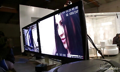 Emilia's Distress: Hot Brunette Gets Cummed On By Two Guys In Lingerie And Stockings