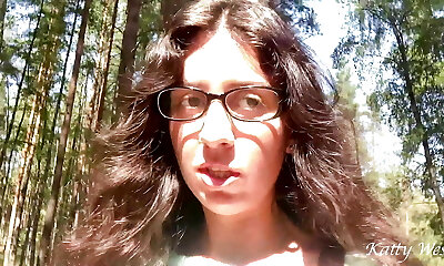 Forest Fuck: Long-haired Glasses Babe Sexily Walks Without Panties